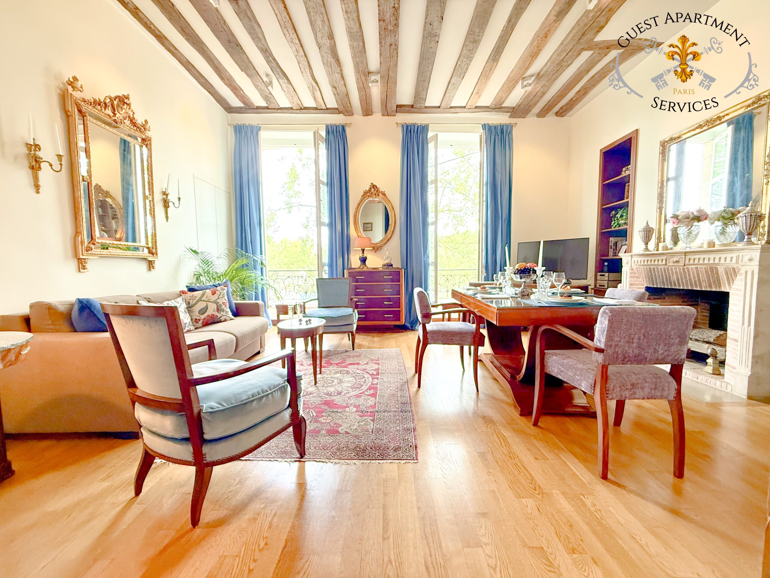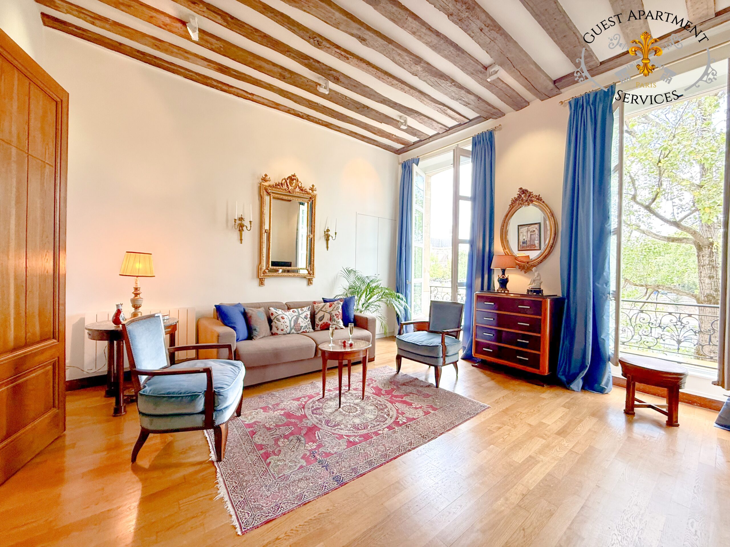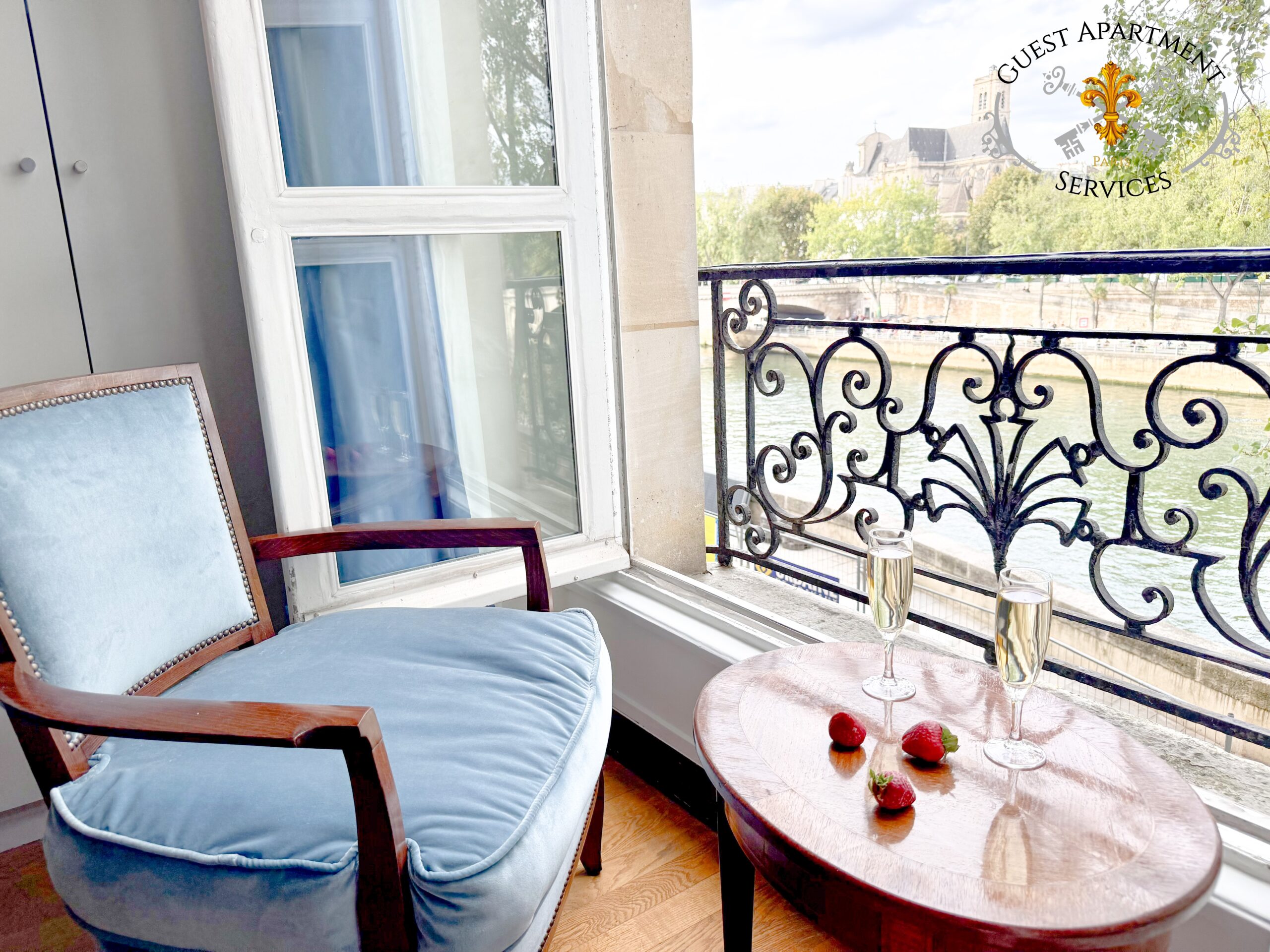 - Two magnificent armchairs, crafted by skilled French artisans, offer a perfect place to relax while taking in the breathtaking views through the large windows. These windows frame a spectacular vista of the Seine River, the Marie and Louis-Philippe bridges, and the iconic Paris City Hall, creating a mesmerizing panorama. Furthermore, you can enjoy the delightful sight of the famous bateaux-mouches leisurely cruising down the river, adding an ever-changing touch of Parisian life to the scene.